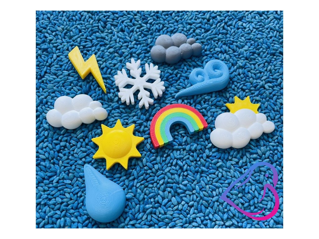 Produkt obsahuje: slunce, mrak šedý, mrak bílý, duha, blesk, vítr, kapka, vločka, mrak se sluncem