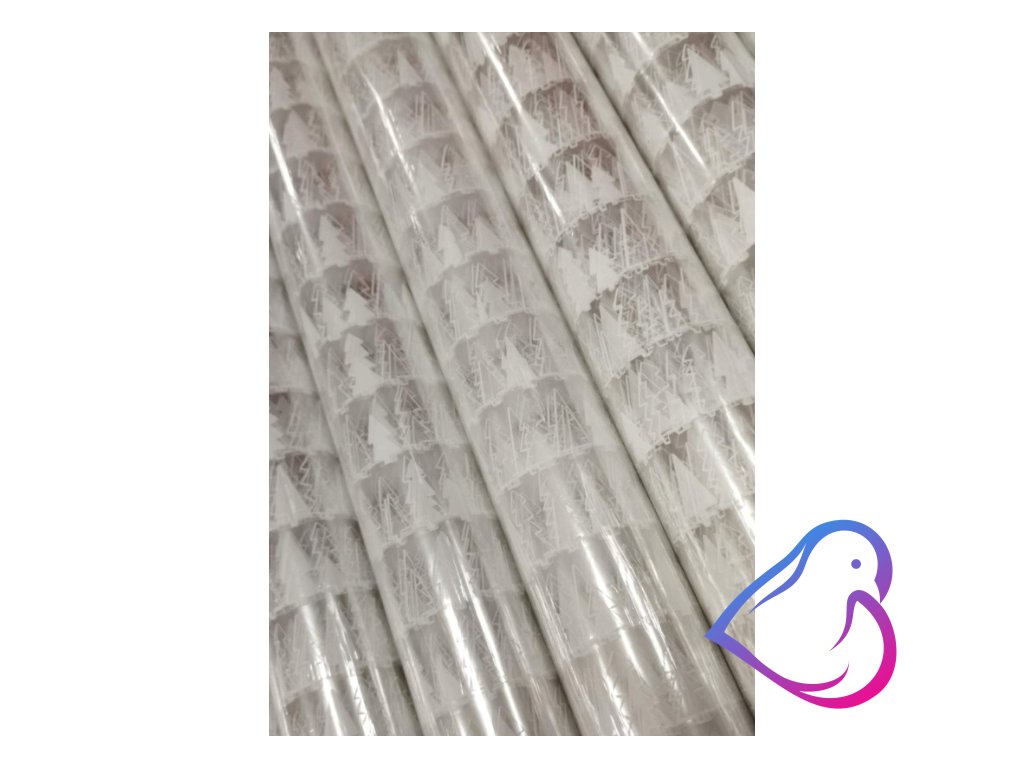 Celofán transparentní v roli s vánočním potiskem bílých stromečků.