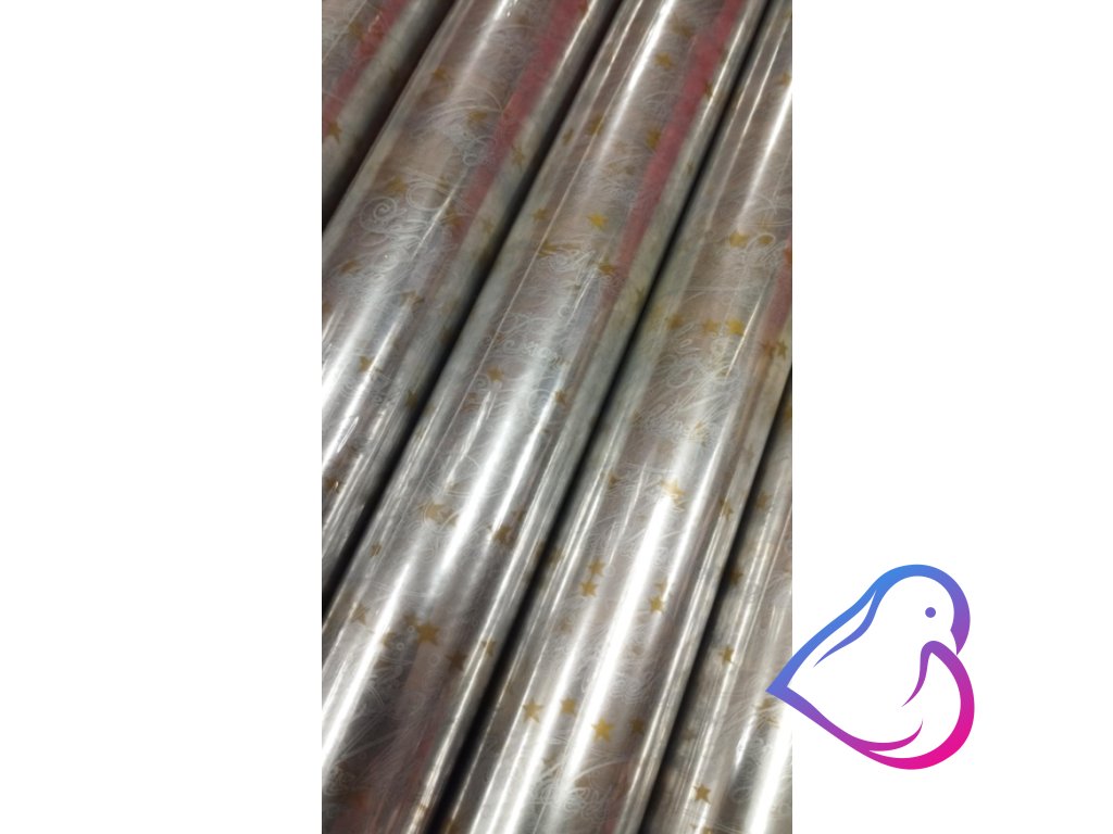 Celofán transparentní v roli s vánočním potiskem zlatých hvězd + nápisy.