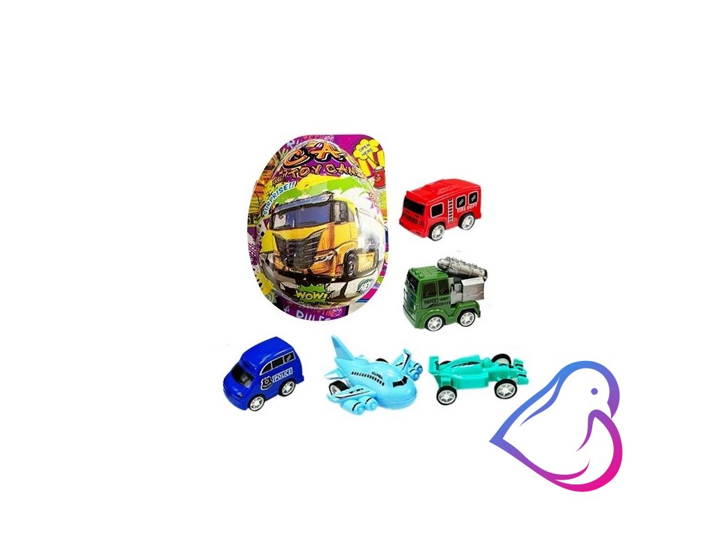 Plastové vajíčko (cca. 10cm) s plastovým modelem dopravního prostředku na setrvačník (7cm) a