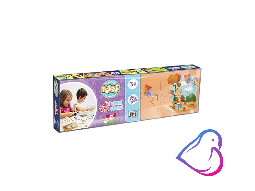 Krabička obsahuje 26 barevných puzzle kartiček s různými motivy, díky nimž se děti učí poznávat roční období a ještě si jejich skládáním procvičují jemnou motoriku.