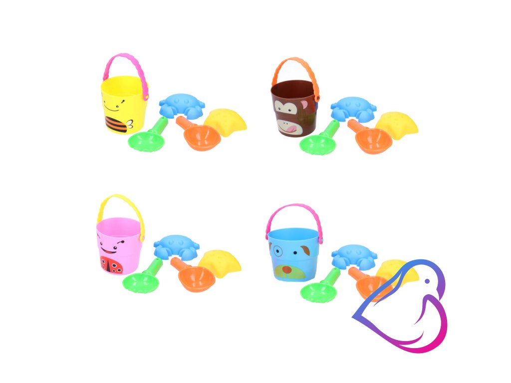 Obsah balení: kyblík s obrázkem zvířátka (8 cm), 2 lopatičky, 2 formičky.