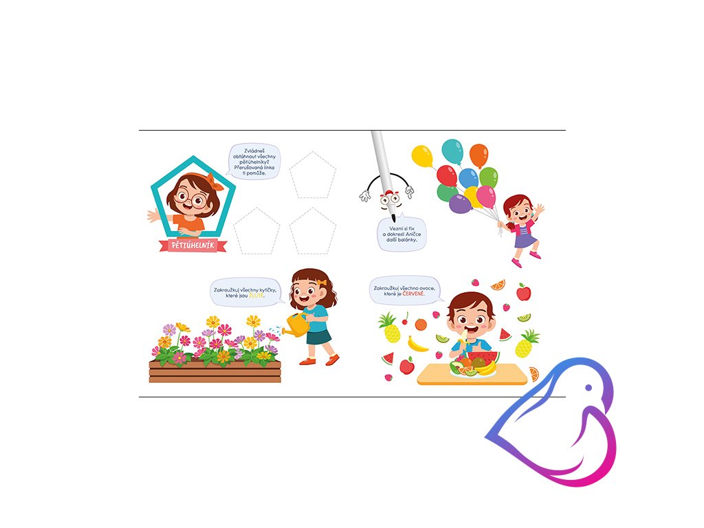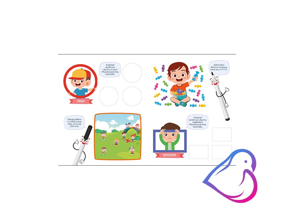 Titul obsahuje 22 stíratelných stran s úkoly pro trénování předškolních dovedností. Fix je součástí balení.