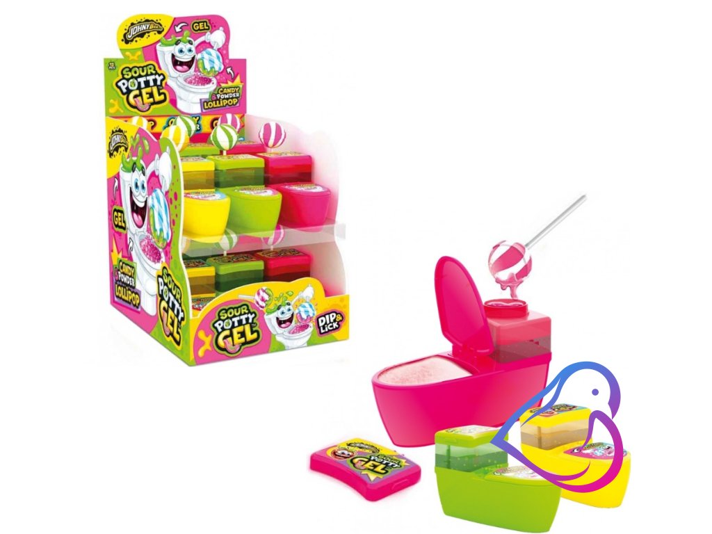 Plastový záchod s lízátkem (9g), šumivým práškem (20g) a ovocným gelem (22g).