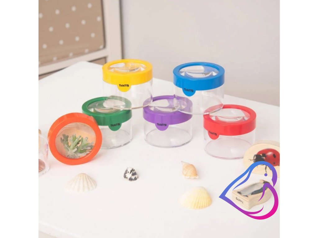 Nádoby mají pestrobarevné nasazovací víčka s čočkou o průměru 6 cm, která umožňuje až 3x zvětšení pro důkladné sledování. Můžete je doplnit například TickiT duhovou lupu nebo kleště.