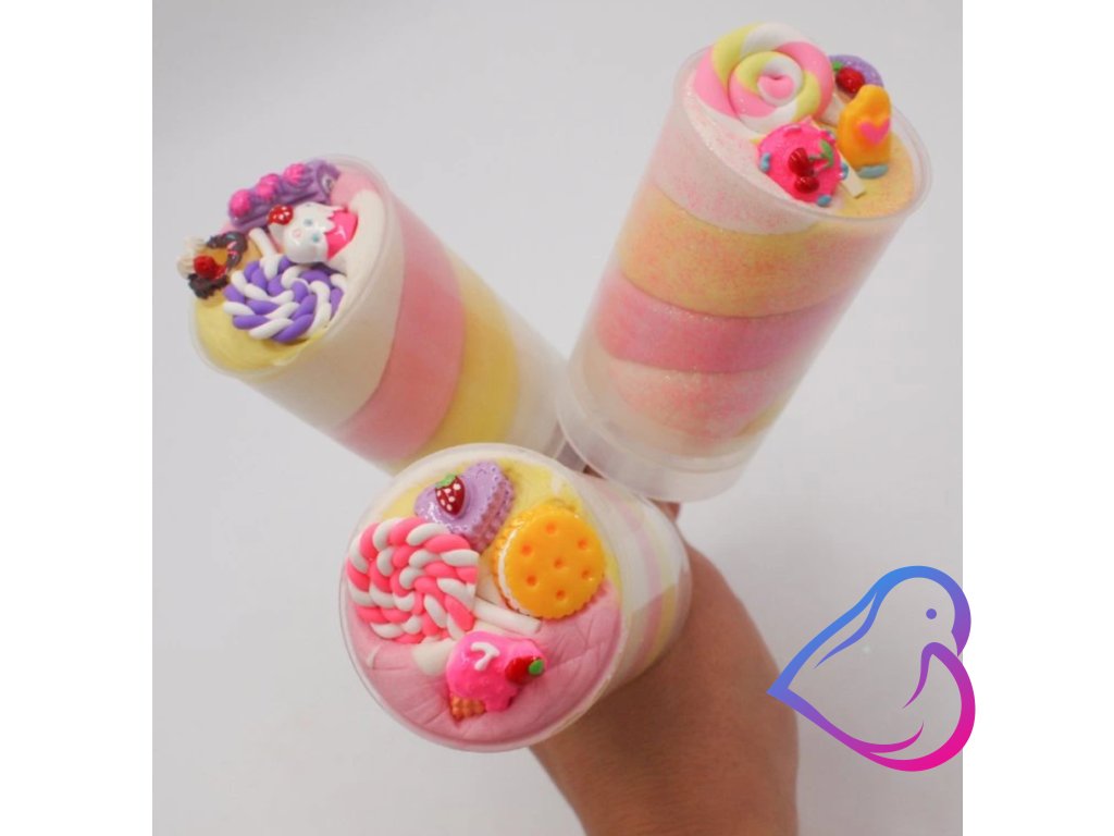 Modelína, která je ukrytá ve vysunovací nádobce. Stačí vysunout a šup na hru. Tato obsahuje tříbarevnou modelínu a miniatury sladkostí.