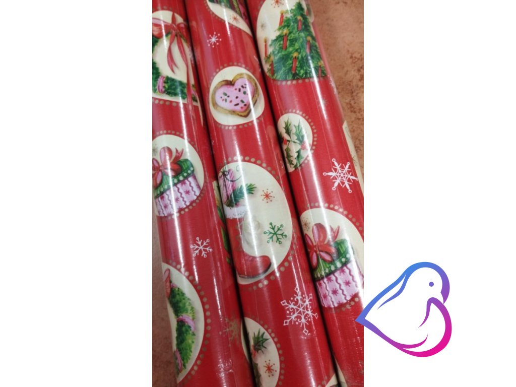Vánoční balící papír červený zdobený různými motivy (stromeček, ponožka, dárek, věnec apod.)