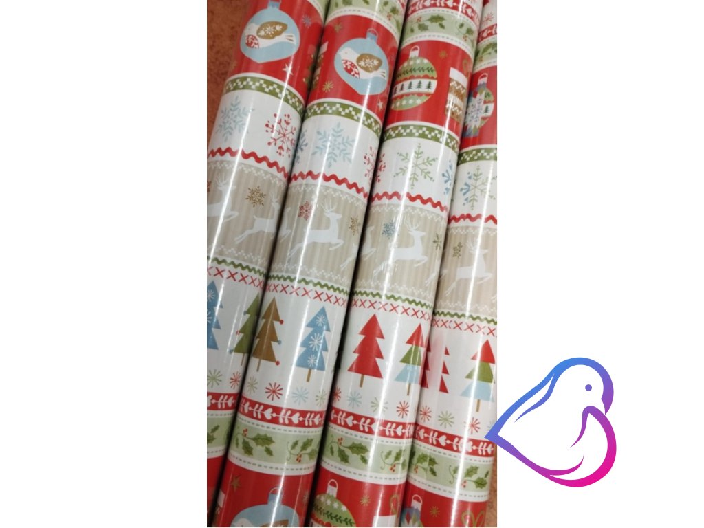 Vánoční balící papír s motivem baněk, sobů a stromů.