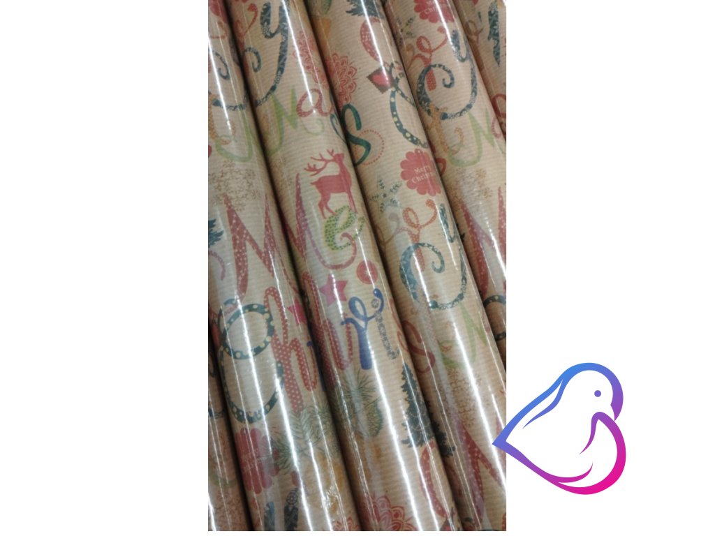 Vánoční balící přírodní papír s motivem barevných nápisů a obrázků.