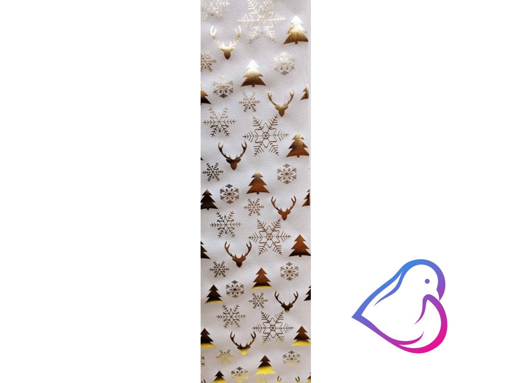 Vánoční běhoun s motivem zlatých vloček a sobů pro dokonale slavnostní chvíle.
