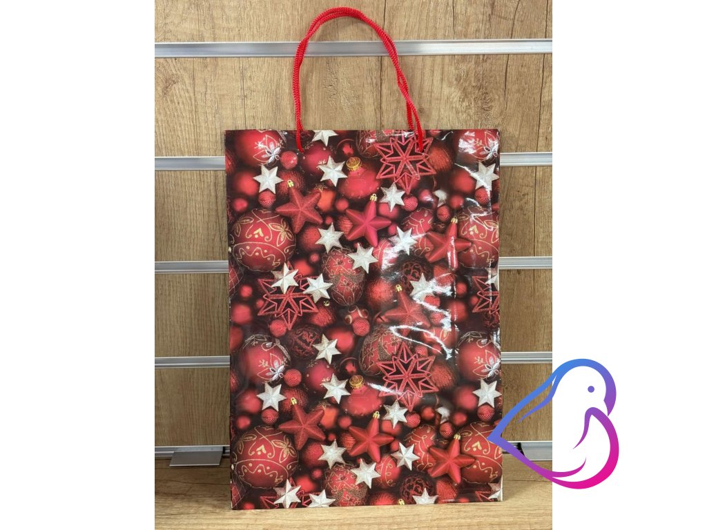 Vánoční dárková taška s motivem červených baněk.