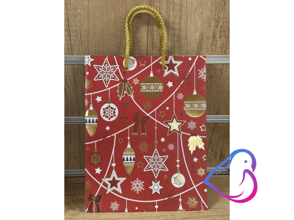 Vánoční dárková taška červená s motivem zlatých baněk.
