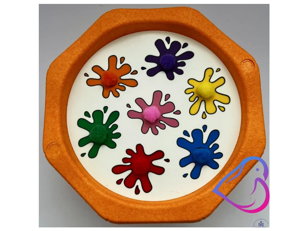 Do každého fleku můžeš vkládat bambulky, korálky, přírodniny nebo cokoliv, co odpovídá barvě – a při tom trénovat jemnou motoriku, postřeh, barvocit i kreativitu.